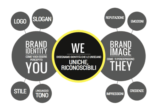 La Brand Identity è invece l’insieme degli elementi di comunicazione che stanno alla base di un’azienda, per pianificare una strategia di comunicazione.